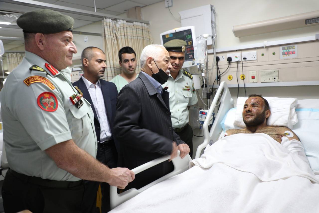 واستمع العيسوي، بحضور مدير عام الخدمات الطبية الملكية العميد الطبيب يوسف جمال زريقات، إلى شرح من رئيس اختصاص الجراحة العامة العميد الطبيب سمير الصمادي، عن الحالة العامة للمصابين الذين يستدعي علاجهم عدة أيام في المستشفى، حيث أنهم يعانون من حروق خفيفة في الوجه وجروح بسيطة في الساقين وحالتهم العامة جيدة.
