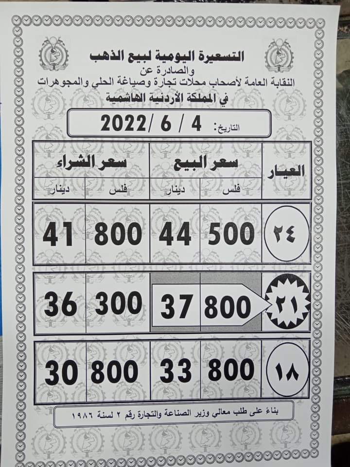 ويشمل التقريــر أسعار المعدن عيارات ( 24، 21، 18) ، كونها الأكثر تداولا في الأردن.