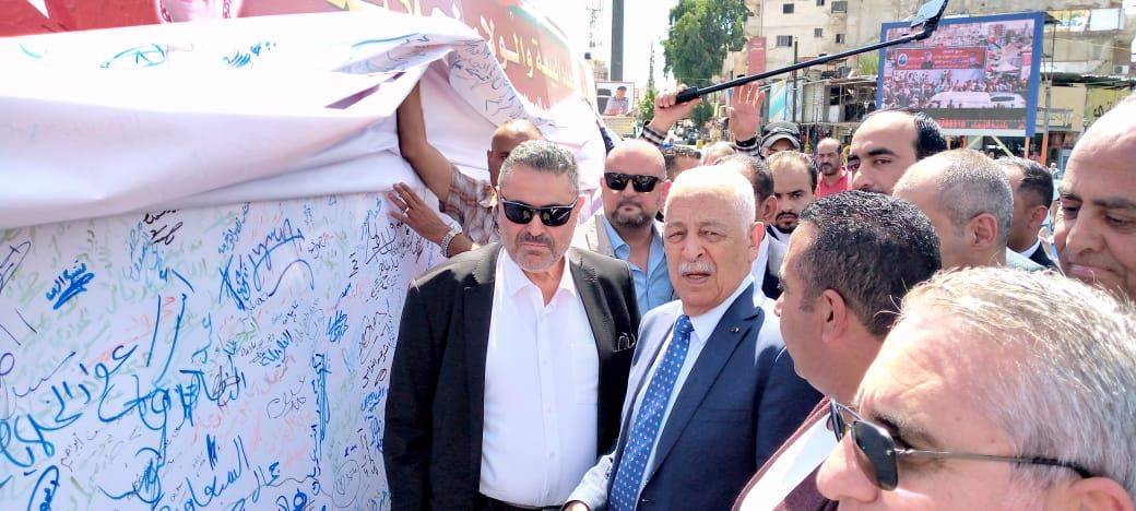 سلم رئيس بلدية الزرقاء المهندس عماد المومني وثيقة تجديد البيعة والولاء لجلالة الملك عبد الله الثاني ابن الحسين المعظم وولي عهده الامين ، سمو الامير الحسين بن عبد الله الثاني المعظم ، بعنوان مع الملك ، الى رئيس الديوان الملكي يوسف العيسوي بحضور محافظ الزرقاء حسن الجبور ، على ميدان الجيش العربي في الزرقاء .