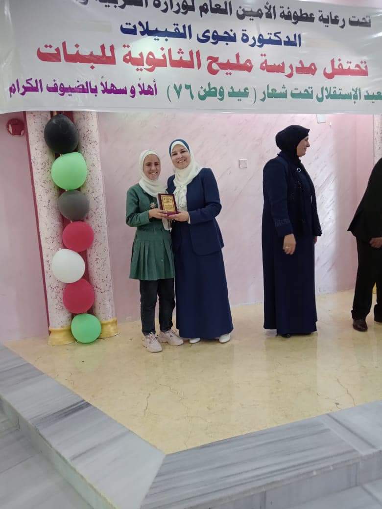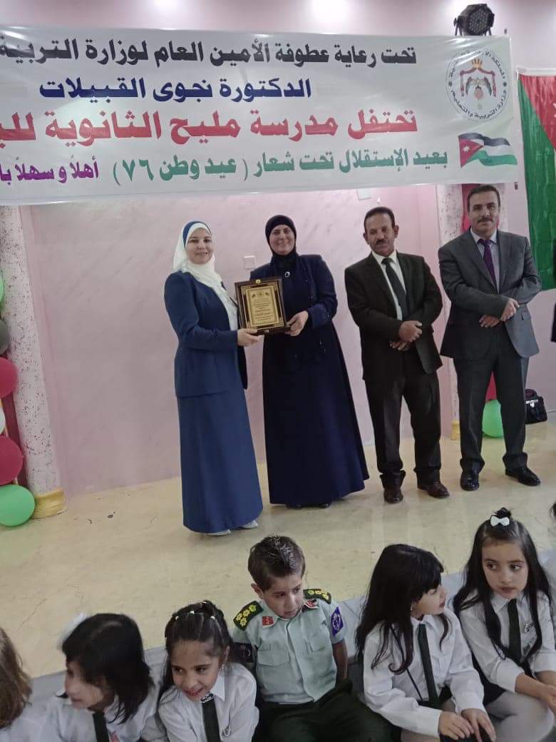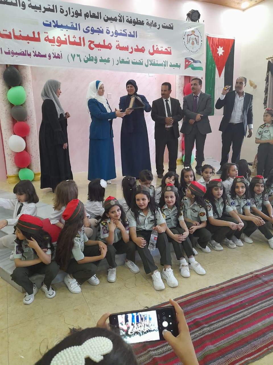 رعت أمين عام وزارة التربية والتعليم الدكتورة نجوى قبيلات بحضور مديرة التربية والتعليم الأستاذة خولة البداينة وجمع من الأسرة التربوية والمجتمع المحلي والطلبة مساء تربويا وطنيا نظمته مدرسة مليح الثانوية للبنات بمناسبة عيد الاستقلال السادس والسبعين.