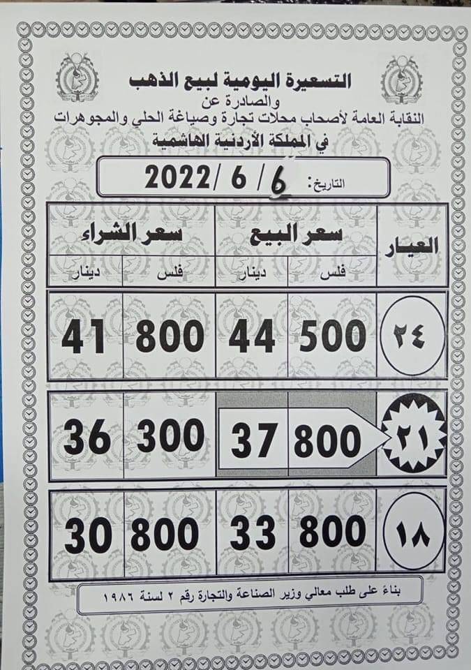 وبلغ سعر بيع الغرام الواحد من الذهب عياري 24 و18 لغايات الشراء من محلات الصاغة عند 44.50 و33.80 دينار على التوالي.