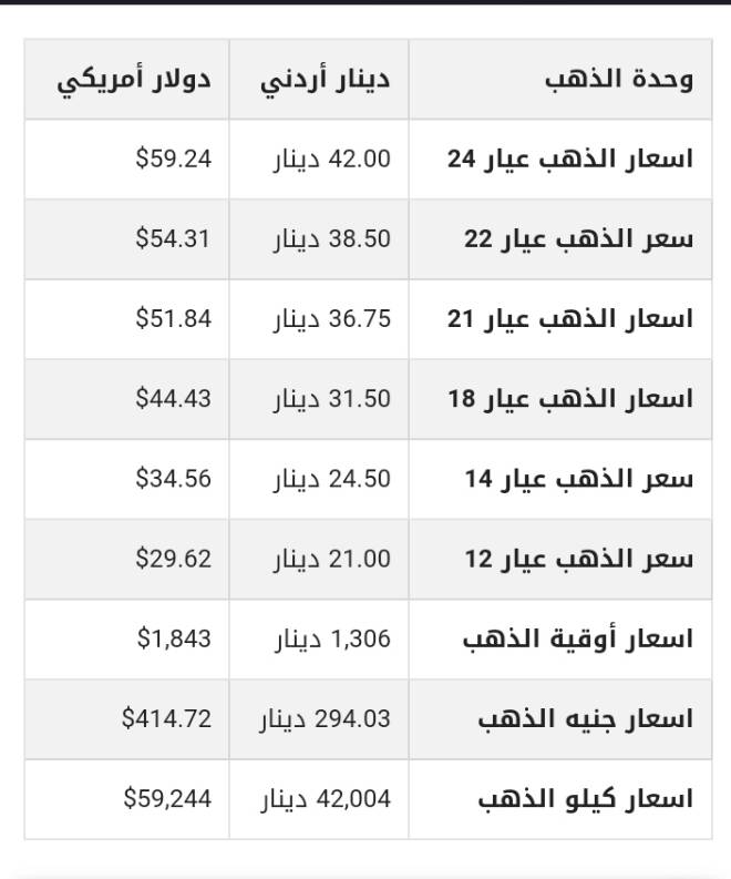 ويشمل التقرير أسعار المعدن في الاردن بجميع عيارته (24,22,21,18,14,12 ) .