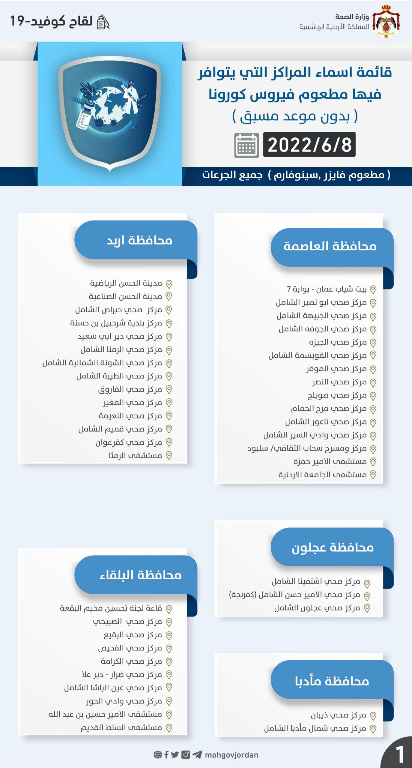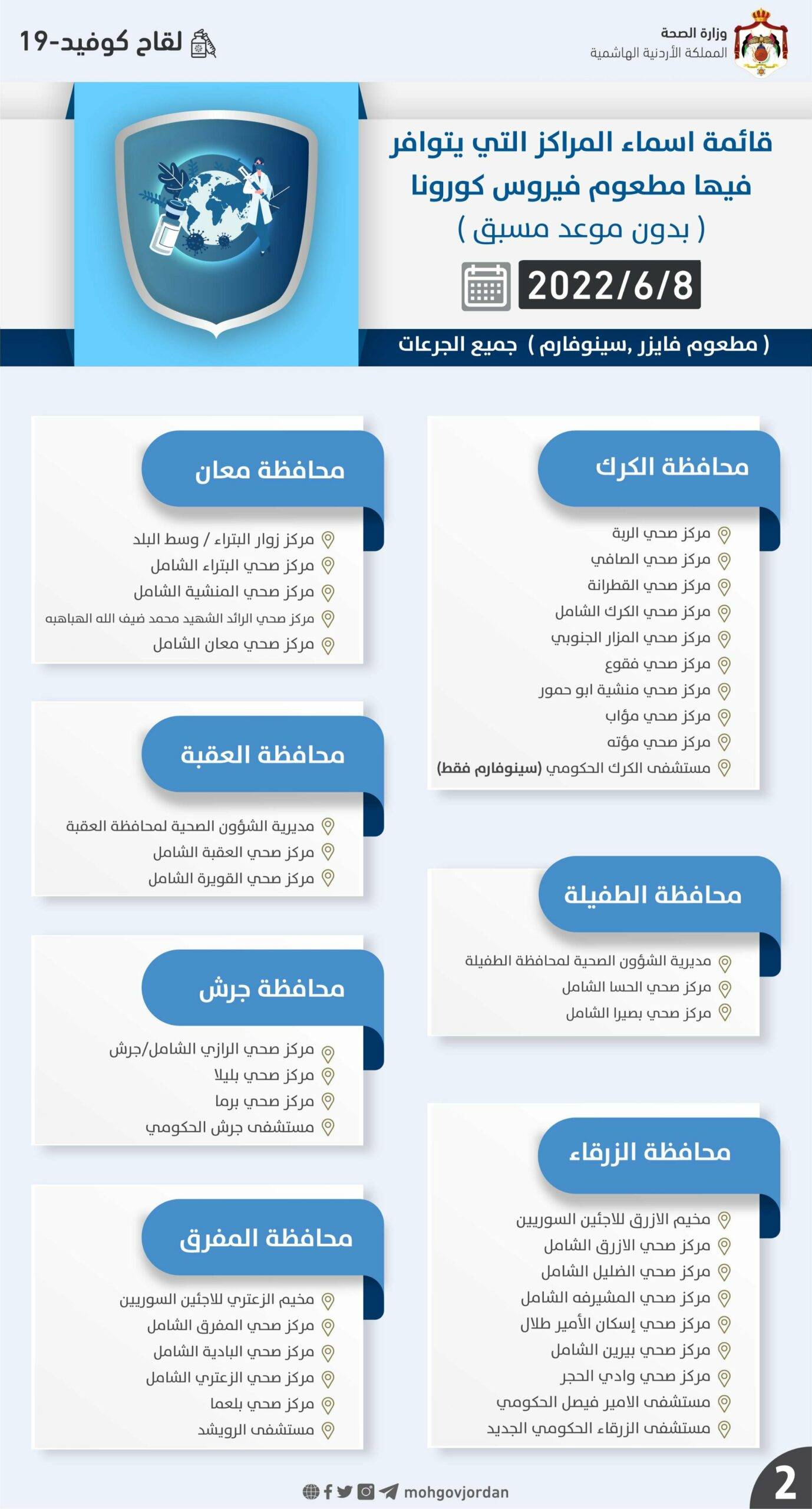 أعلنت وزارة الصحة عن قائمة أسماء المراكز التي يتوافر فيها مطعوم فيروس كورونا (دون موعد مسبق) وبجميع الجرعات ليوم الأربعاء.