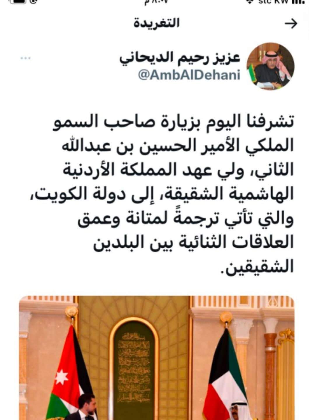نشر السفير الكويتي لدى الاردن عزيز الديحاني على حسابه على تويتر مرحبا بزيارة ولي العهد الأمير الحسين ابن عبدالله الثاني الى الكويت وتاليا ما جاء في غريدة:
