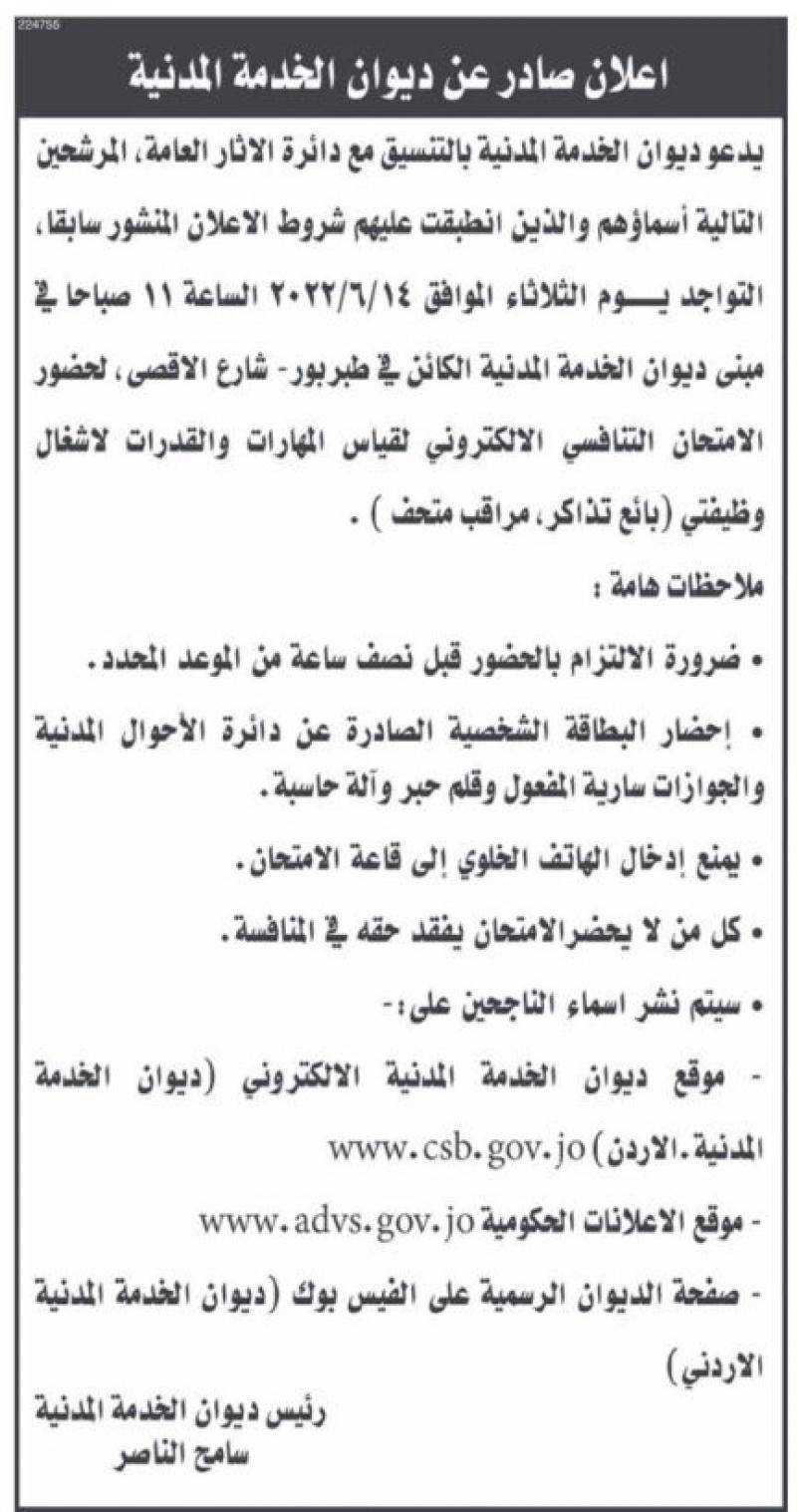 دعا ديوان الخدمة المدنية بالتنسيق مع دائرة الآثار العامة، مرشحين لحضور الامتحان التنافسي الإلكتروني.