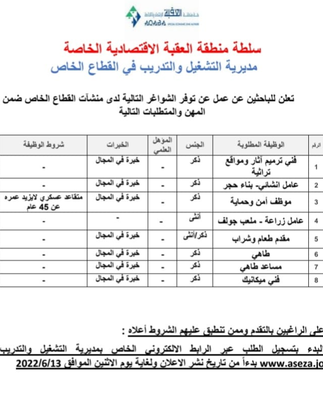 أعلنت  سلطة منطقة العقبة الاقتصادية الخاصة / مديرية التشغيل والتدريب في القطاع الخاص للباحثين عن عمل عن توفر الشواغر التالية في القطاع الخاص.