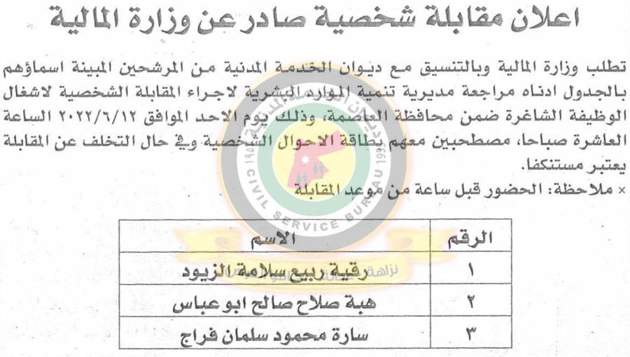 دعا ديوان الخدمة المدنية بالتعاون مع مختلف الوزارات والمؤسسات الحكومية، التالية اسماؤهم لاجراء المقابلات الشخصية وعقد الامتحان التنافسي لغايات التعيين.
