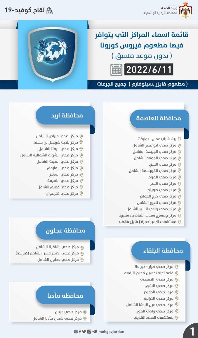 أعلنت وزارة الصحة قائمة أسماء المراكز التي يتوافر فيها مطعوم فيروس كورونا (بدون موعد مسبق) بجميع الجرعات لليوم السبت .