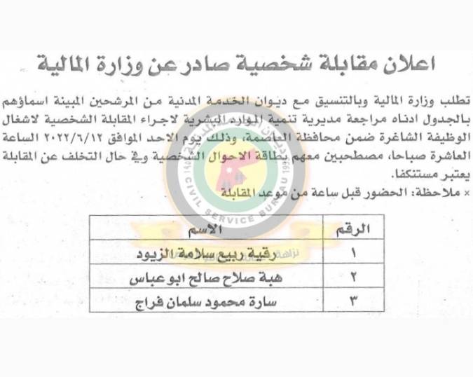 اعلان مقابلة شخصية صادر عن وزارة المالية ...أسماء