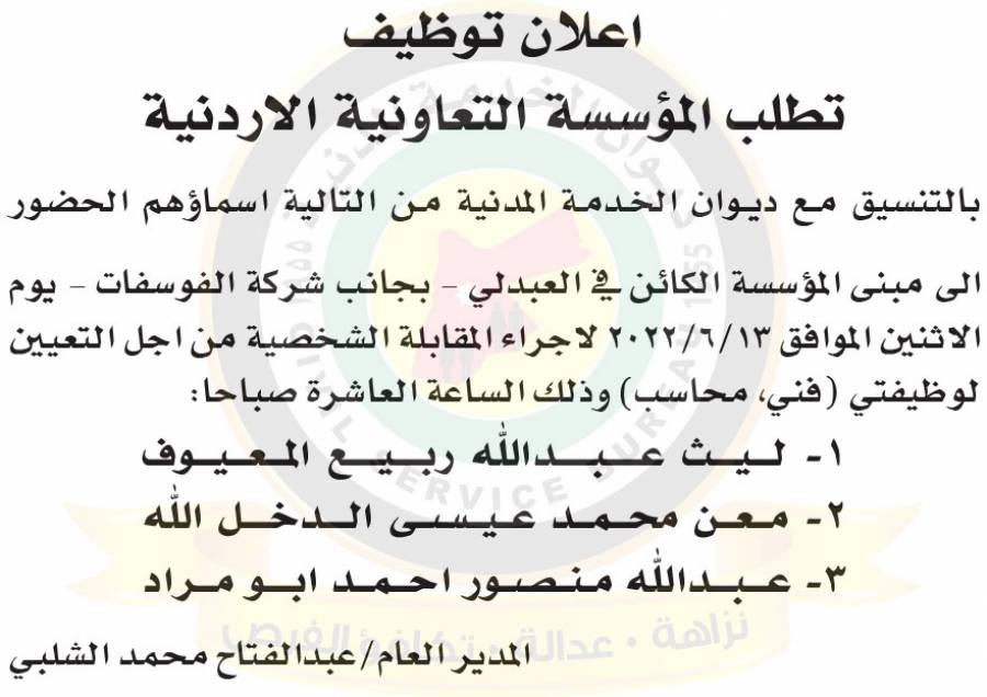 مدعوون لإجراء مقابلة شخصية في المؤسسة التعاونية الأردنية ...أسماء