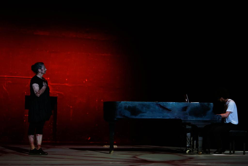 في أداء فريد ونادر، يجعل عازف البيانو الذي ترافق موسيقاه العرض بشكل حي، يغادر كرسيه لكي يشارك في الحيز ذاته كممثل وراقص، قدم عرجون، الذي رسخ اسمه خلال السنوات الماضية كأحد أكثر مؤلفي الموسيقى التونسيين والعرب تجديدا وشغفا بالتجريب، وجها جديدا من وجوه موهبة الملونة. ها هو، مثل طفل صغير في حضرة امرأة تكبره بثلاثة عقود، يفرح بها ويحتضنها ويرش عليها زينة حمراء.