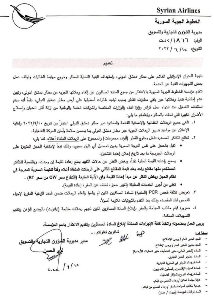 وجاء في بيان شركة الخطوط الجوية السورية: "في ضوء إلغاء الرحلات النظامية والإضافية القادمة والمغادرة عبر مطار دمشق الدولي اعتبارا من تاريخ 10-6-2022 ولحين الإعلان عن مواعيد جديدة للتشغيل سيتم معالجة التذاكر المصّدرة داخل وخارج القطر (أفراد، مجموعات) والمحجوزة على الرحلات التي تم إلغاؤها".