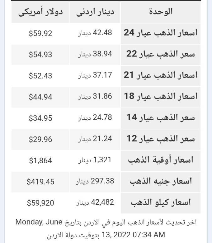 ويشمل التقرير أسعار المعدن في الاردن بجميع عيارته (24,22,21,18,14,12 ) .