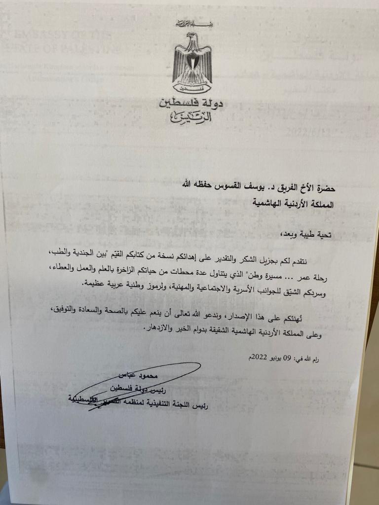 وقال عباس في كتابه الموجه للفريق الطبيب يوسف القسوس نتقدم لكم بجزيل الشكر والتقدير على اهدائكم نسخة من كتابكم القيم بين الجندية والطب رحلة عمر ...مسيرة وطن .