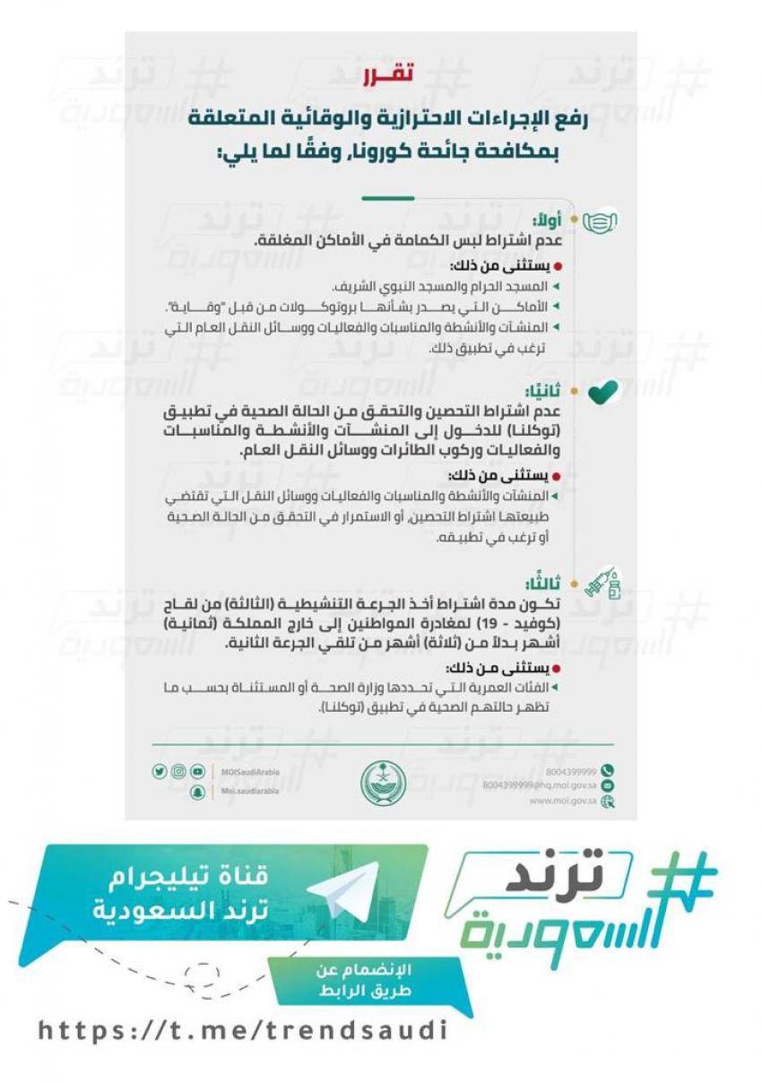 قررت المملكة العربية السعودية اليوم الاثنين، رفع الإجراءات الاحترازية والوقائية المتعلقة بمكافحة جائحة كورونا.