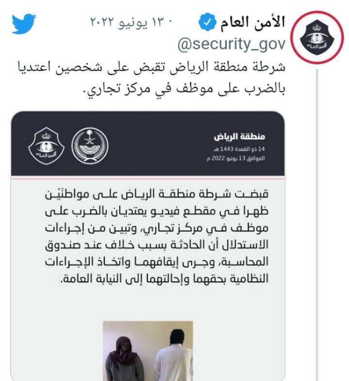 وقالت شرطة منطقة الرياض، في بيان صدر عنها، إنها ”نجحت في القبض على مواطنين سعوديين اعتديا بالضرب على موظف في مركز تجاري"، ونشرت الشرطة صورة للرجلين، حيث ظهر أحدهما بزيه الغامق ذاته الذي ظهر فيه خلال الاعتداء.