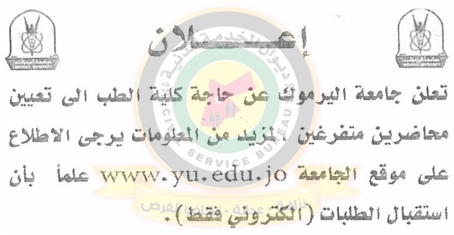 أعلنت جامعة اليرموك عن حاجة كلية الطب إلى تعيين محاضرين متفرغين .