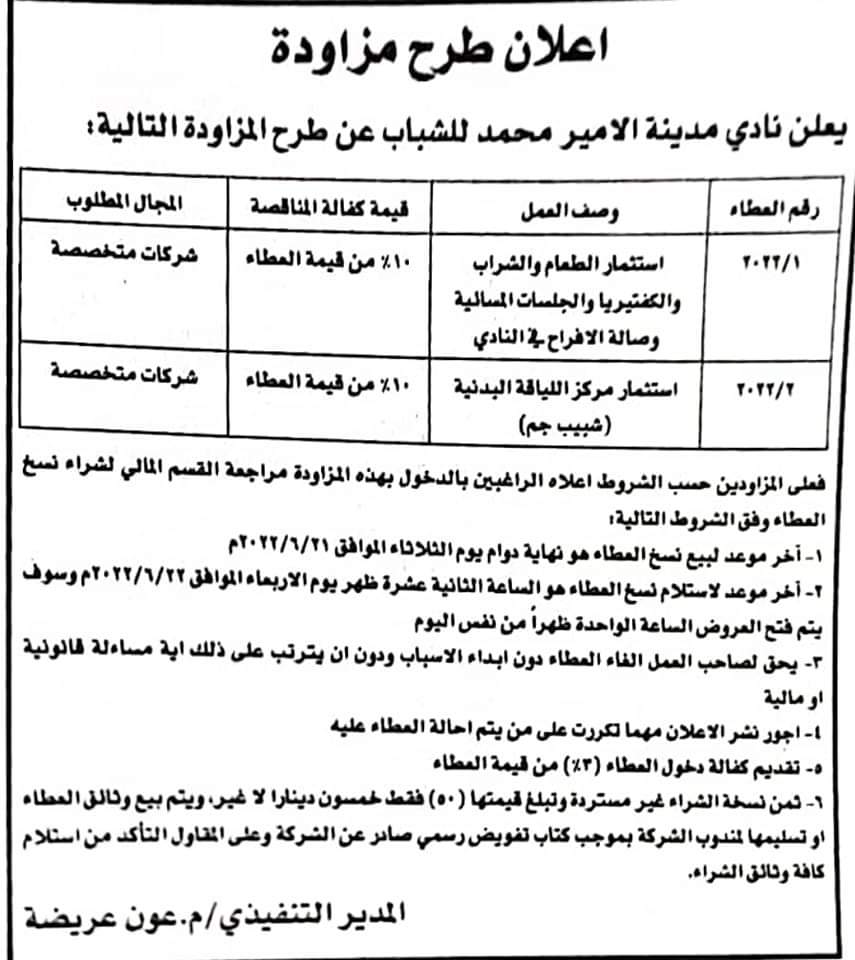 وتاليًا الاعلان الذي به كافة تفاصيل العطاء :