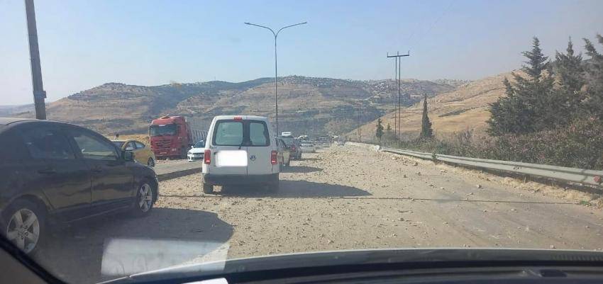 وقالت إدارة السير في مديرية الأمن العام، إن نزول العدسية يشهد حادث تدهور وانقلاب لمركبة (تريلا)، واصطدامها بسبع مركبات، مما أدى لتباطؤ الحركة المرورية في الموقع بسبب انسكاب حمولة التريلا من الحجارة على الطريق".