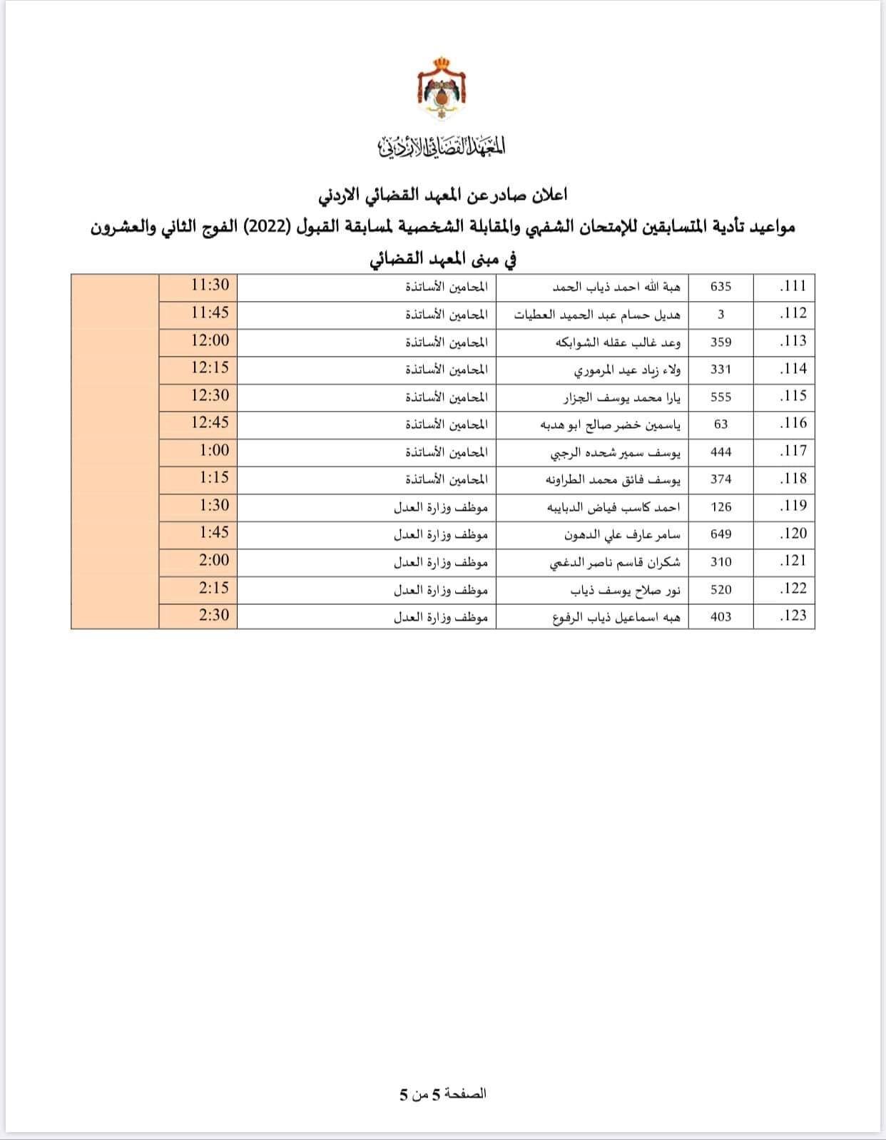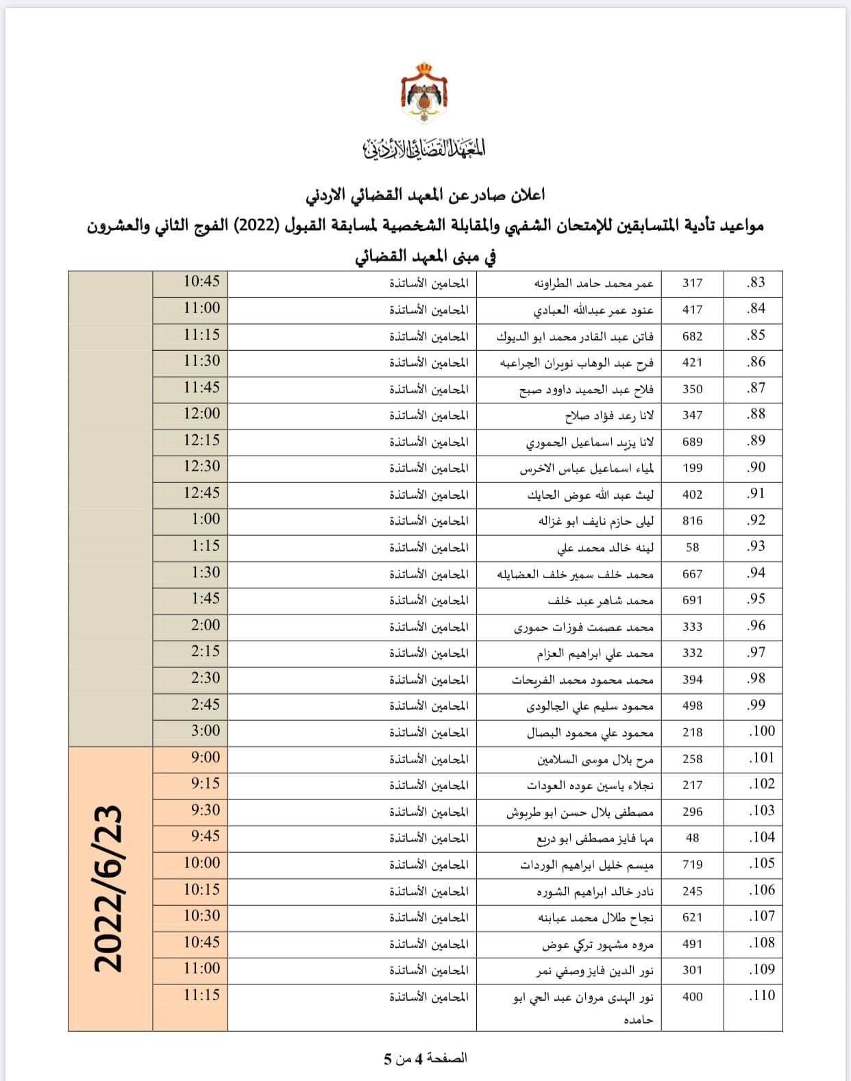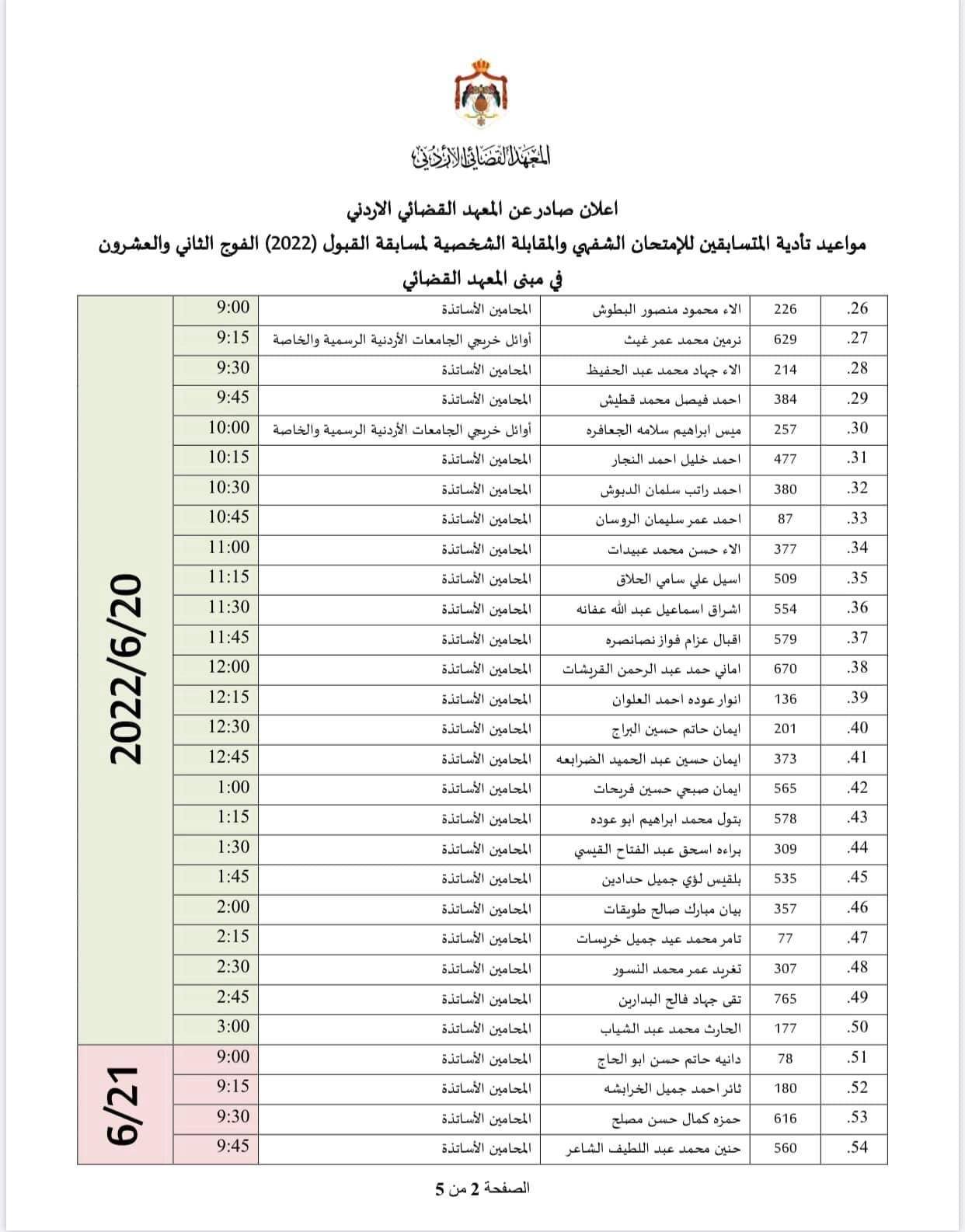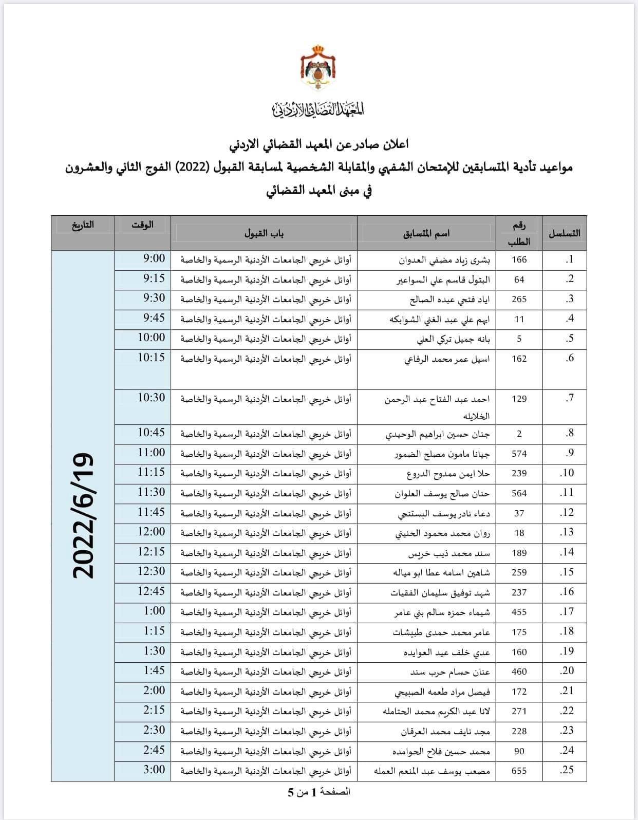 أعلن المعهد القضائي الأردني عن مواعيد تأدية المتسابقين للإمتحان الشفهي والمقابلة الشخصية لمسابقة القبول (2022) الفوج الثاني والعشرون في مبنى المعهد القضائي، وفق المواعيد المذكوره أدناه :