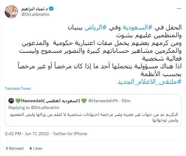 وأضافت في تغريدة أخرى ”الحفل في السعودية وفي الرياض ببنبان، والمنظمون عليهم بشوت، ومن كرمهم بعضهم يحمل صفات اعتبارية حكومية والمدعوون والمكرمون مشاهير، حساباتهم كبيرة والتصوير مسموح، وليست فعالية شخصية، إذا هناك مسؤولية يتحملها أحد، ما إذا كان مرخصاً أو غير مرخص حسب أنظمة ملتقى الإعلام الجديد".