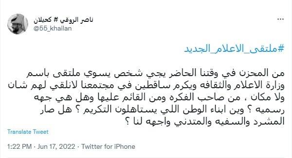 وكتب مدون يدعى ناصر الروقي ”ملتقى الإعلام الجديد، من المحزن في وقتنا الحاضر يجي شخص يسوي ملتقى باسم وزارة الإعلام والثقافة ويكرم ساقطين في مجتمعنا لا نلقي لهم شان ولا مكان، من صاحب الفكرة ومن القائم عليها وهل هي جهة رسمية؟ وين أبناء الوطن اللي يستاهلون التكريم؟ هل صار المشرد والسفيه والمتدني واجهه لنا؟".