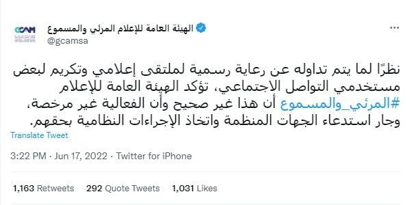 وقالت الهيئة الحكومية ”نظرًا لما يتم تداوله عن رعاية رسمية لملتقى إعلامي وتكريم لبعض مستخدمي التواصل الاجتماعي، تؤكد الهيئة العامة للإعلام المرئي والمسموع أن هذا غير صحيح وأن الفعالية غير مرخصة، وجار استدعاء الجهات المنظمة واتخاذ الإجراءات النظامية بحقهم".