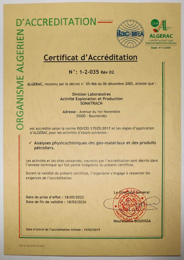 الشهادة التي سلمتها الهيئة الجزائرية للاعتماد (ألجيراك)، هي اعتراف بكفاءة قسم المخابر لمجمع سوناطراك بقدرته على تقديم نتائج تجارب مضمونة ودقيقة ومعترف بها وفق آخر المعايير الدولية المعتمدة.