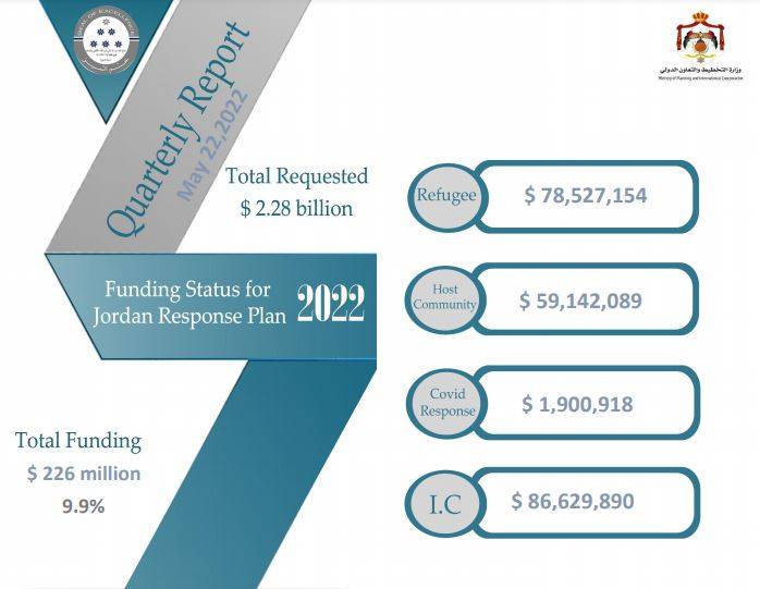 نيروز الإخبارية : بلغ حجم تمويل خطة استجابة الأردن للأزمة السورية 226 مليون دولار، من أصل 2.28 مليار دولار، وبنسبة وصلت إلى 9.9%، وفق وزارة التخطيط والتعاون الدولي.