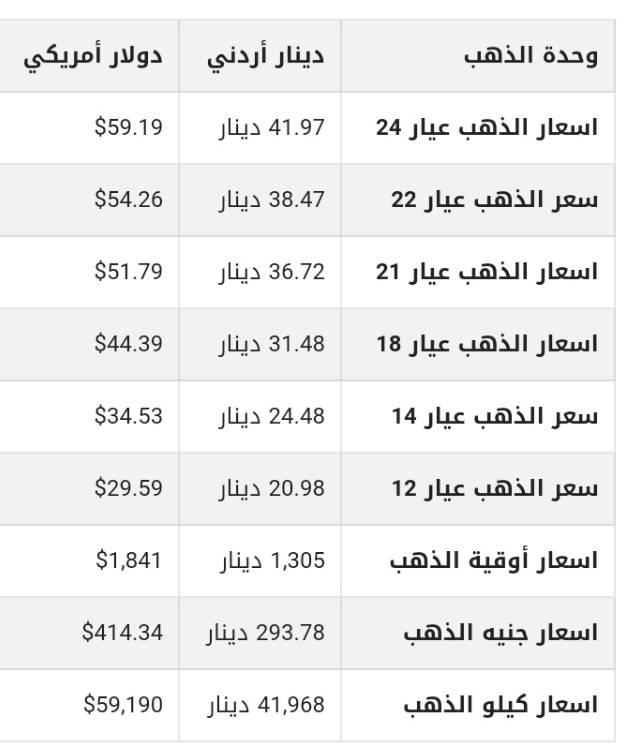 ويشمل التقرير أسعار المعدن في الاردن بجميع عيارته (24,22,21,18,14,12 ) .
