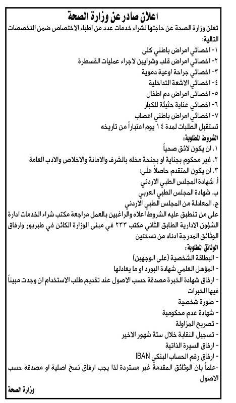 وطلبت الوزارة أطباء ضمن اختصاصات؛ أمراض باطني كلى، أمراض قلب وشرايين، جراحة أوعية دموية، أشعة تداخلية، أمراض دم الأطفال، عناية حثيثة للكبار، أمراض باطني أعصاب.