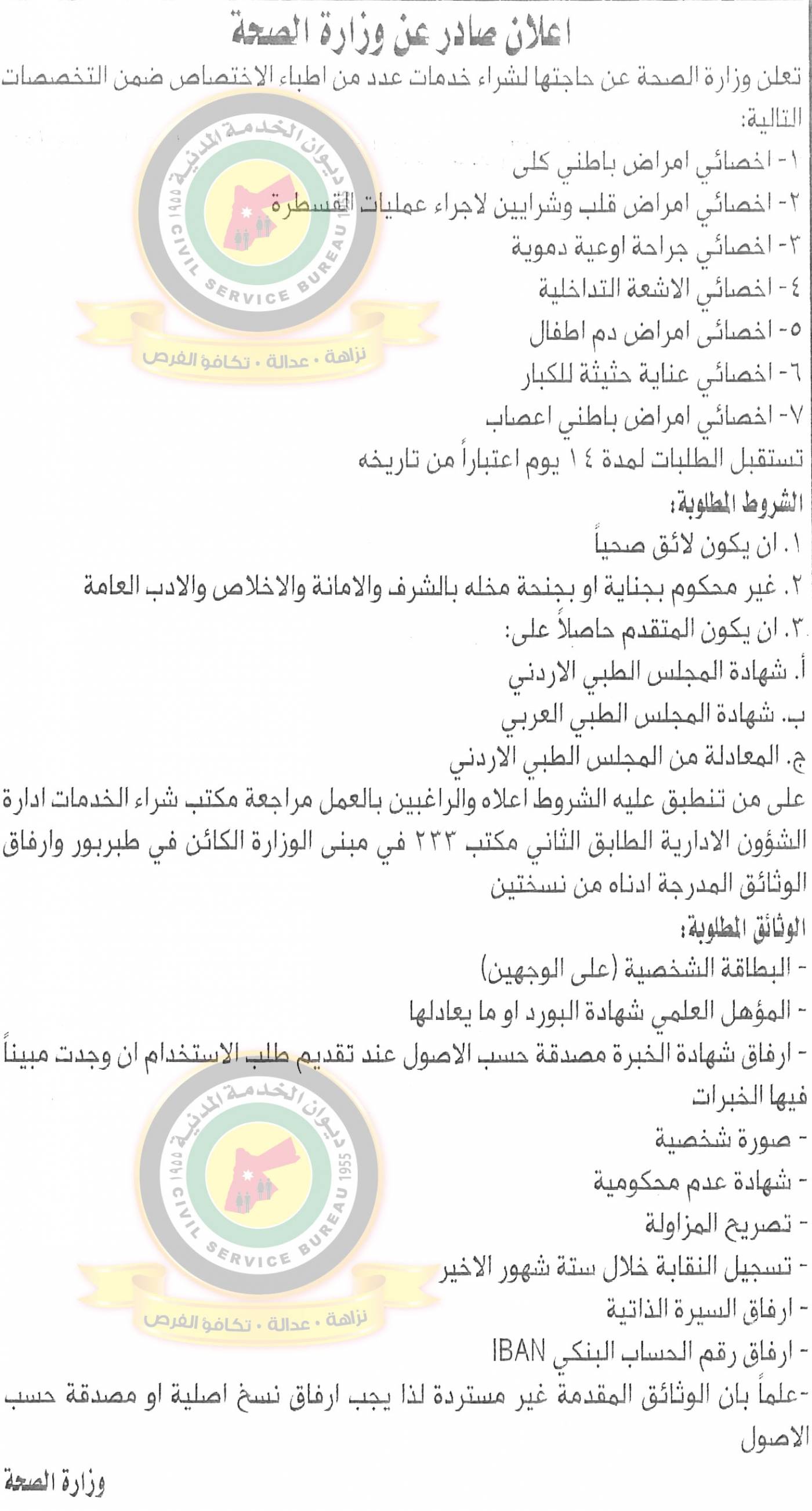 أعلنت وزارة الصحة عن حاجتها لشراء خدمات عدد من أطباء الاختصاص .