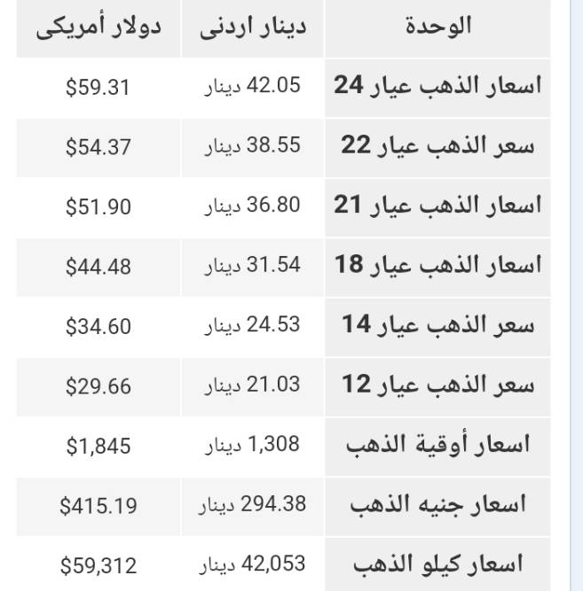ويشمل التقرير أسعار المعدن في الاردن بجميع عيارته (24,22,21,18,14,12 ) .