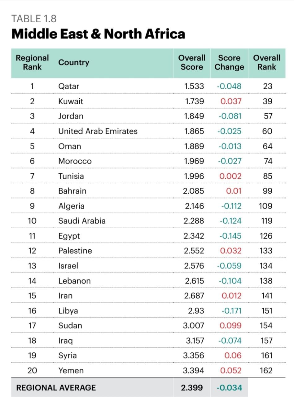 وحل خلف الأردن في منطقة الشرق الأوسط وشمال إفريقيا، كلا من الإمارات وعُمان على التوالي، لتمثل الدول الخمس أفضل دول المنطقة التي يرمز لها باللون الأخضر على خارطة العالم بحسب المؤشر.
