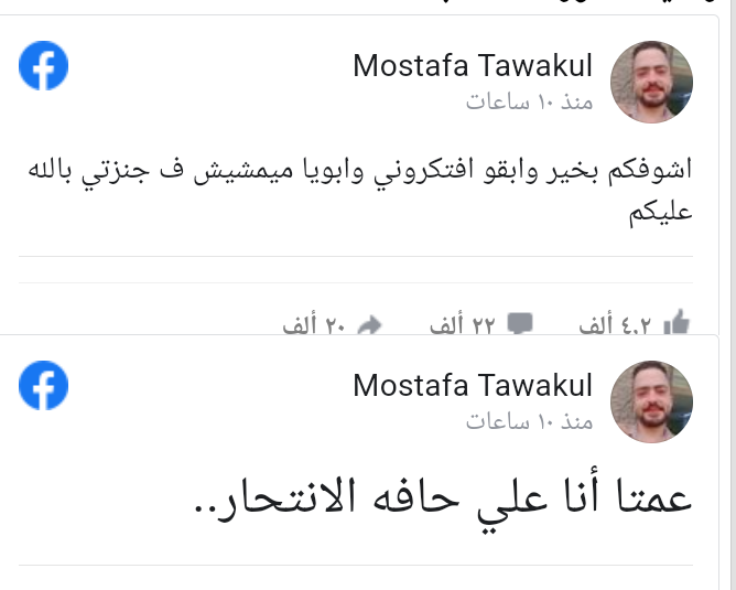 وتداول رواد مواقع التواصل منشورات على "فيسبوك" من حساب شاب يحمل نفس الاسم، يعلن فيها قبل وقت قصير من الحادث أنه سينتحر، ويطلب عدم سير والده في جنازته.