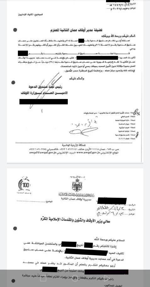وفي التفاصيل، فإن لجنة صندوق الدعوة التابعة لوزارة الأوقاف والشؤون والمقدسات الإسلامية عينت، في 31 أيار 2021 إماما” في أحد مساجد مديرية أوقاف عمان لقاء إكرامية شهرية على حساب صندوق الدعوة، مقدارها 260 دينارا، من تاريخ مباشرته العمل بصورة مؤقتة لحين تأمين المسجد بموظف رسمي، أو لحين انتهاء المخصصات”، وبالفعل باشر الإمام العمل في المسجد، اعتبارا من 2 حزيران 2021.