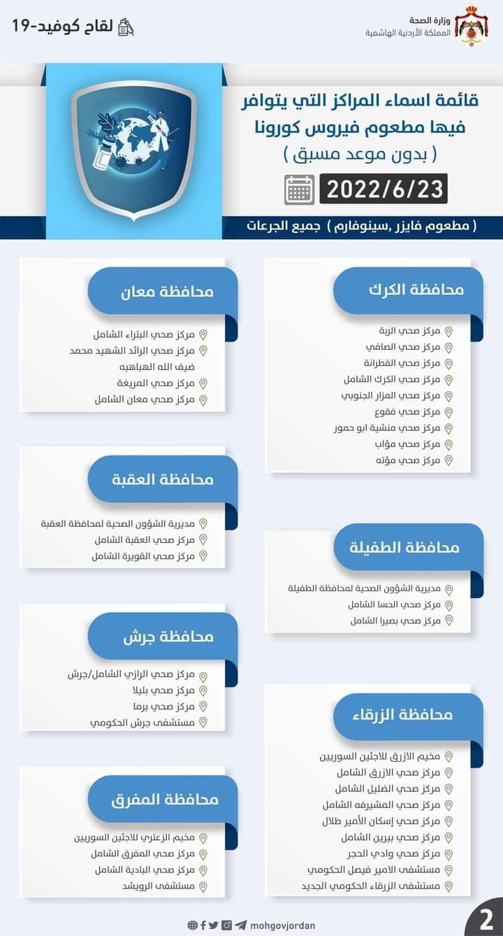 أعلنت وزارة الصحة عن قائمة اسماء المراكز التي يتوافر فيها مطعوم فيروس كورونا (بدون موعد مسبق) #جميع_الجرعات ليوم الخميس الموافق 2022/6/23:
