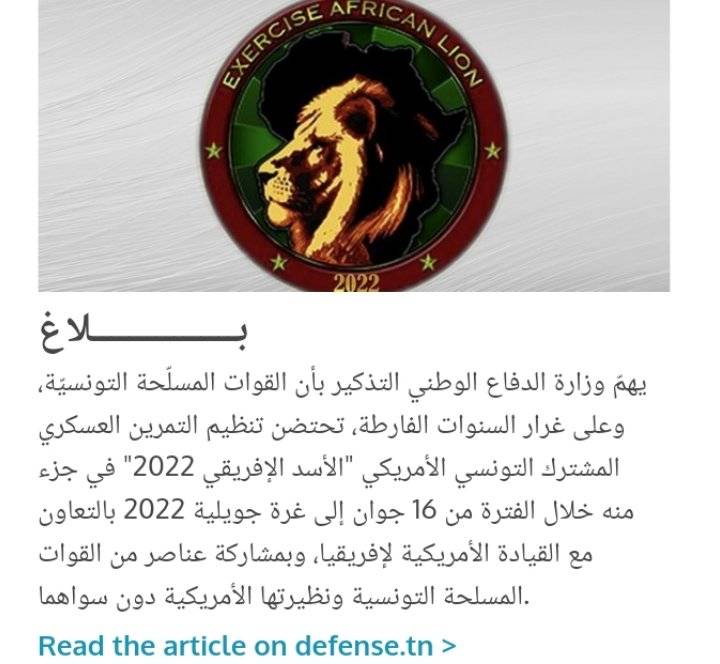 وقالت الوزارة في بلاغ لها اليوم إن "القوات المسلّحة التونسيّة، وعلى غرار السنوات الفارطة، تحتضن تنظيم التمرين العسكري المشترك التونسي الأمريكي "الأسد الإفريقي 2022” في جزء منه خلال الفترة من 16 جوان إلى غرة جويلية 2022 بالتعاون مع القيادة الأمريكية لإفريقيا، وبمشاركة عناصر من القوات المسلحة التونسية ونظيرتها الأمريكية دون سواهما. كما تشارك تونس بعنصر محدود بالمغرب وهو ما تمّ نشره بالبلاغيْن السابقيّن حول ذات الموضوع بتاريخ 14 و21 جوان الجاري".