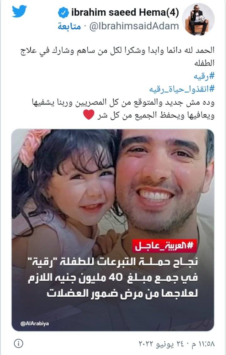 فيما كتب إبراهيم سعيد لاعب منتخب مصر السابق، عبر حسابه على ”تويتر": ”الحمد لله دائما وأبدا وشكرا لكل من ساهم وشارك في علاج الطفلة رقية، وده مش جديد والمتوقع من كل المصريين، وربنا يشفيها ويعافيها ويحفظ الجميع من كل شر".