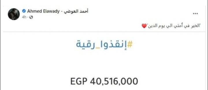 وفي تفاعل سريع مع الحملة، علق الفنان المصري أحمد العوضي عبر حسابه على موقع التواصل الاجتماعي ”فيسبوك"، بعد اكتمال مبلغ 40 مليون جنيه، ونشر صورة توضح جمع المبلغ، الذي زاد بعد ذلك بدقائق 3 ملايين آخرى بحسب والد الطفلة.
