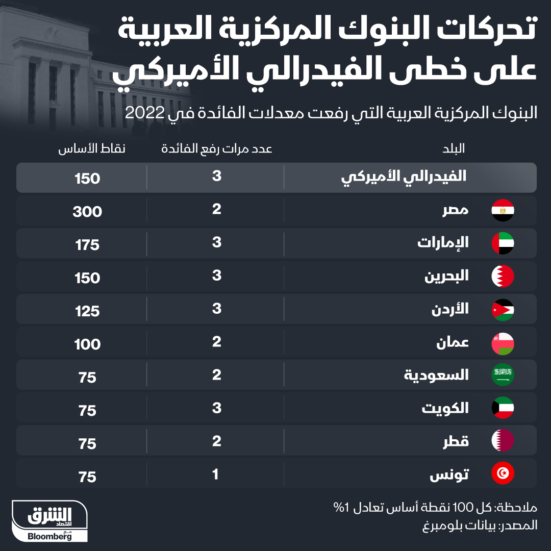ورفعت مصر أسعار الفائدة مرتين حتى الآن خلال العام الحالي بواقع 300 نقطة أساس، بينما رفعت الإمارات والبحرين والأردن والكويت أسعار الفائدة ثلاث مرات خلال 2022، ورفعت تونس أسعار الفائدة مرة واحدة خلال العام الحالي.