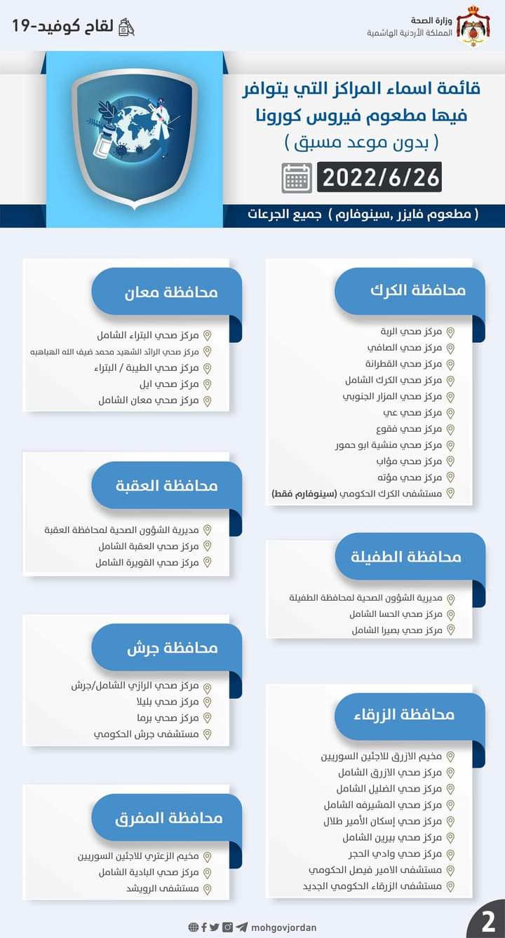 أعلنت وزارة الصحة عن قائمة اسماء المراكز التي يتوافر فيها مطعوم فيروس كورونا (بدون موعد مسبق) #جميع_الجرعات ليوم الاحد الموافق 2022/6/26: