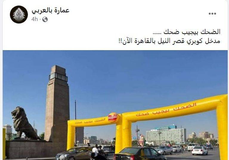 انتقد بعض مستخدمي مواقع التواصل الاجتماعي، في مصر، دعاية على كوبري قصر النيل بالقاهرة، لصالح إحدى شركات رقائق البطاطس.