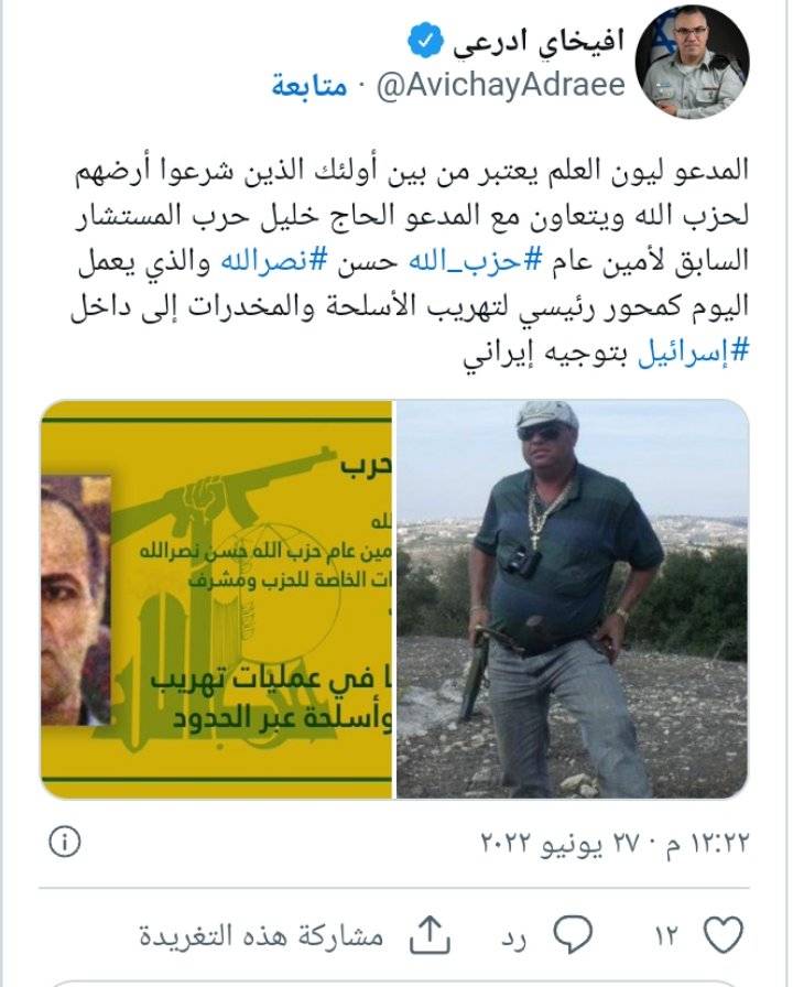 وقال المتحدث باسم الجيش الإسرائيلي أفيخاي أدرعي، في سلسلة تغريدات عبر ”تويتر"، إن ”ليون العلم، المقيم في بلدة رميش في جنوب لبنان والمعروف بنشاطاته العديدة في تهريب المخدرات والأسلحة في المنطقة، هو المسؤول عن محاولات التهريب التي جرت الأسبوع الماضي".
