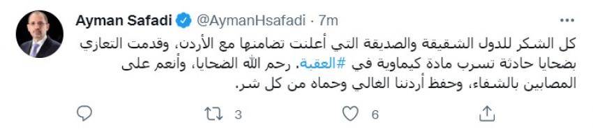 وقال الصفدي في تغريدة عبر تويتر، "كل الشكر للدول الشقيقة والصديقة التي أعلنت تضامنها مع الأردن، وقدمت التعازي بضحايا حادثة تسرب مادة كيماوية في #العقبة. رحم الله الضحايا، وأنعم على المصابين بالشفاء، وحفظ أردننا الغالي وحماه من كل شر".