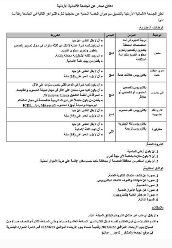 أعلنت الجامعة الألمانية الأردنية وبالتنسيق مع ديوان الخدمة المدنية الثلاثاء عن حاجتها لملء عدد من الشواغر.