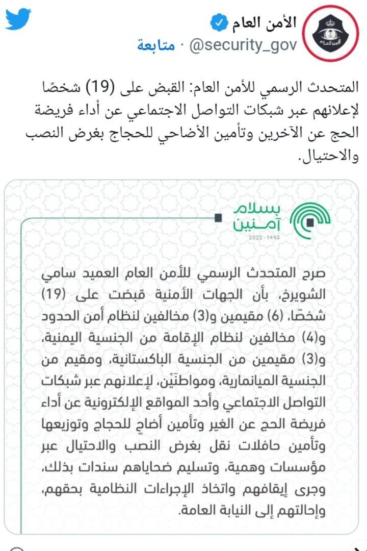 أعلنت السلطات السعودية يوم الثلاثاء، عن ضبط 19 شخصاً تورطوا بجرائم نصب واحتيال من خلال تسليم ضحاياهم سندات وهمية يزعمون أنها تثبت أداء فريضة الحج عن الغير وتوفير أضاحي للحجاج وتوزيعها وخدمات أخرى وهمية بمقابل مادي.