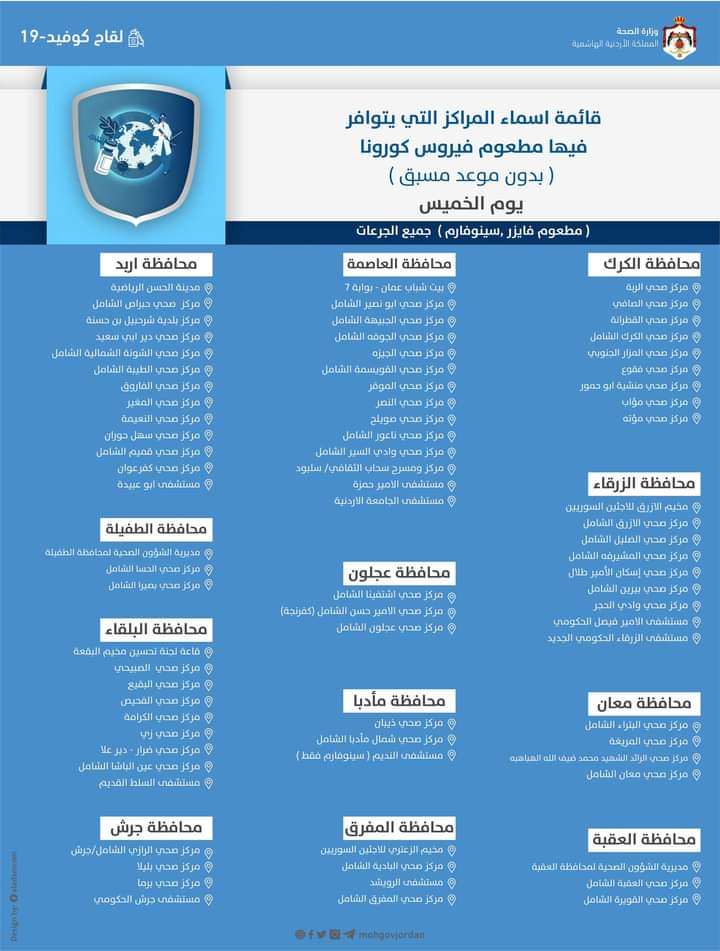 أعلنت وزارة الصحة قائمة اسماء المراكز التي يتوافر فيها مطعوم فيروس كورونا (بدون موعد مسبق) #جميع_الجرعات ليوم الخميس: