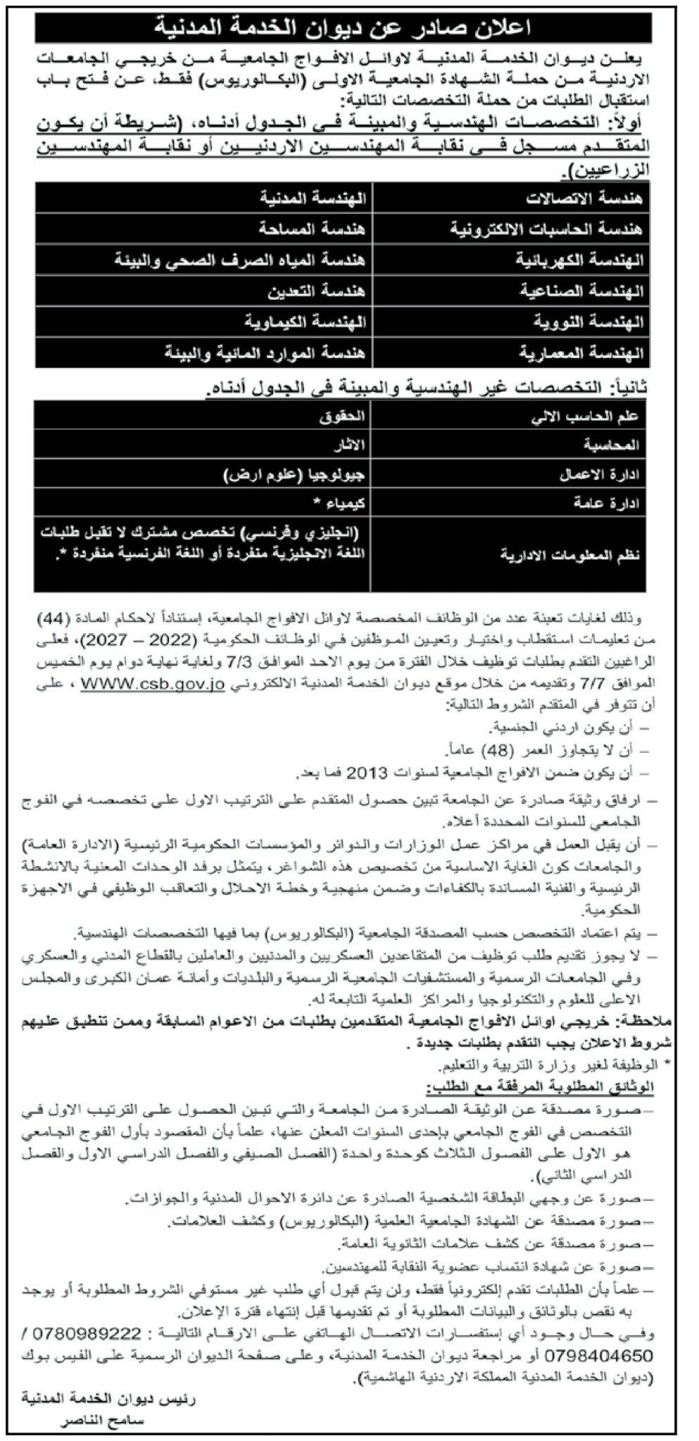 ويبدأ التقدم بطلبات التوظيف من يوم الأحد الموافق 3/7/2022 ولغاية نهاية دوام يوم الخميس الموافق 7/7/2022 عبر موقع ديوان الخدمة المدنية (www.csb.gov.jo).