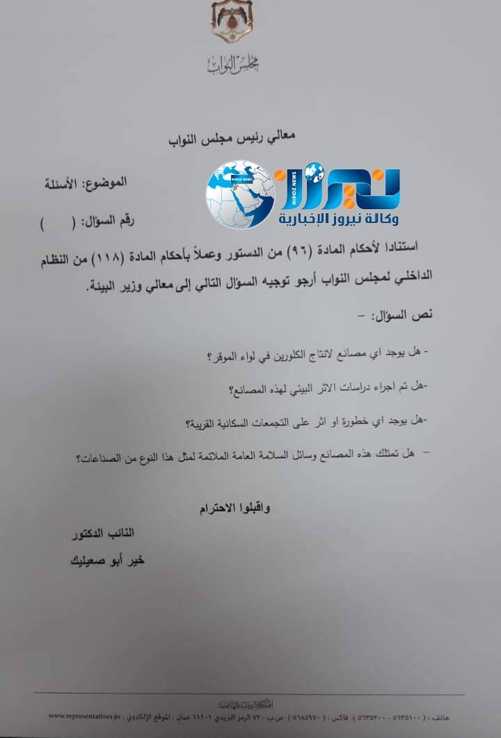 ونص السؤال الذي وجهه ابو صعليك لوزير البيئة ،هل يوجد أي مصانع لإنتاج الكلورين في لواء الموقر ؟ و هل تم إجراء دراسات الأثر البيئي لهذه المصانع ؟ و هل يوجد خطورة أو اثر على التجمعات السكانية القريبة ؟ و هل تم تمتلك هذه المصانع وسائل السلامة العامة الملائمة لمثل هذا النوع من الصناعات ؟ .